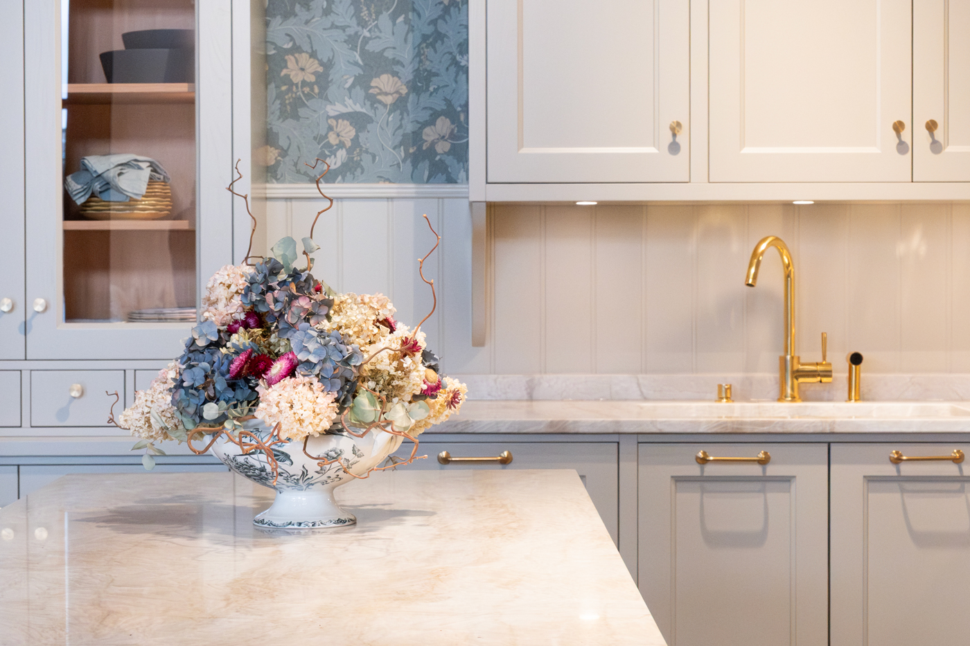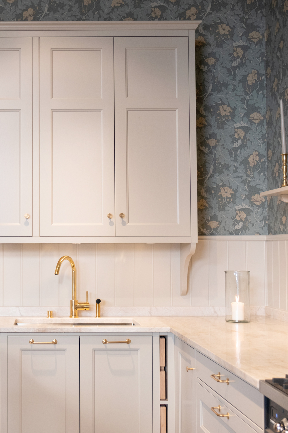 Det här är ett kök som känns varmt redan när man kliver in. Färgerna är mjuka, materialen naturliga och detaljerna noga utvalda för att skapa en helhet som håller över tid.