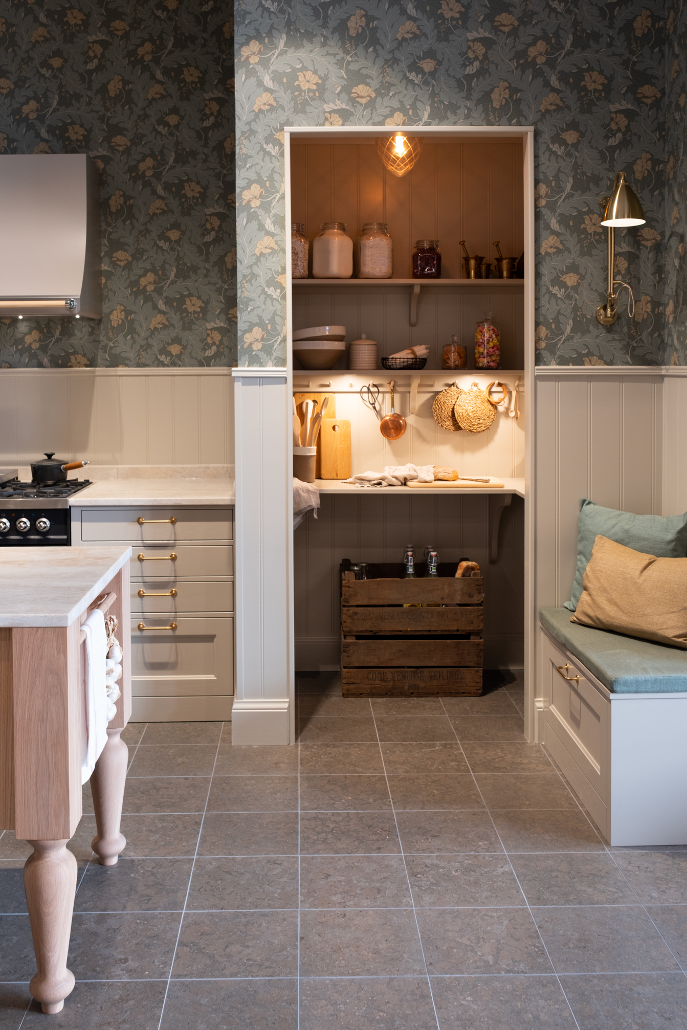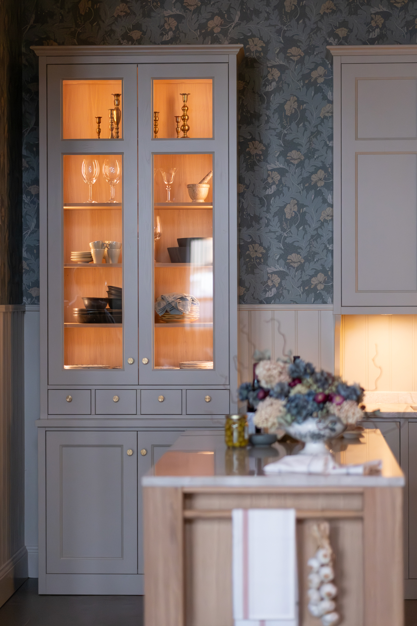 Den spis som tar för sig och ett praktiskt skafferi ger köket karaktär. Den mässingsfärgade kranen och beslagen bryter av på ett varmt sätt utan att ta över. Vitrinskåpet med belysning ger liv åt porslinet och skapar en mjuk stämning på.