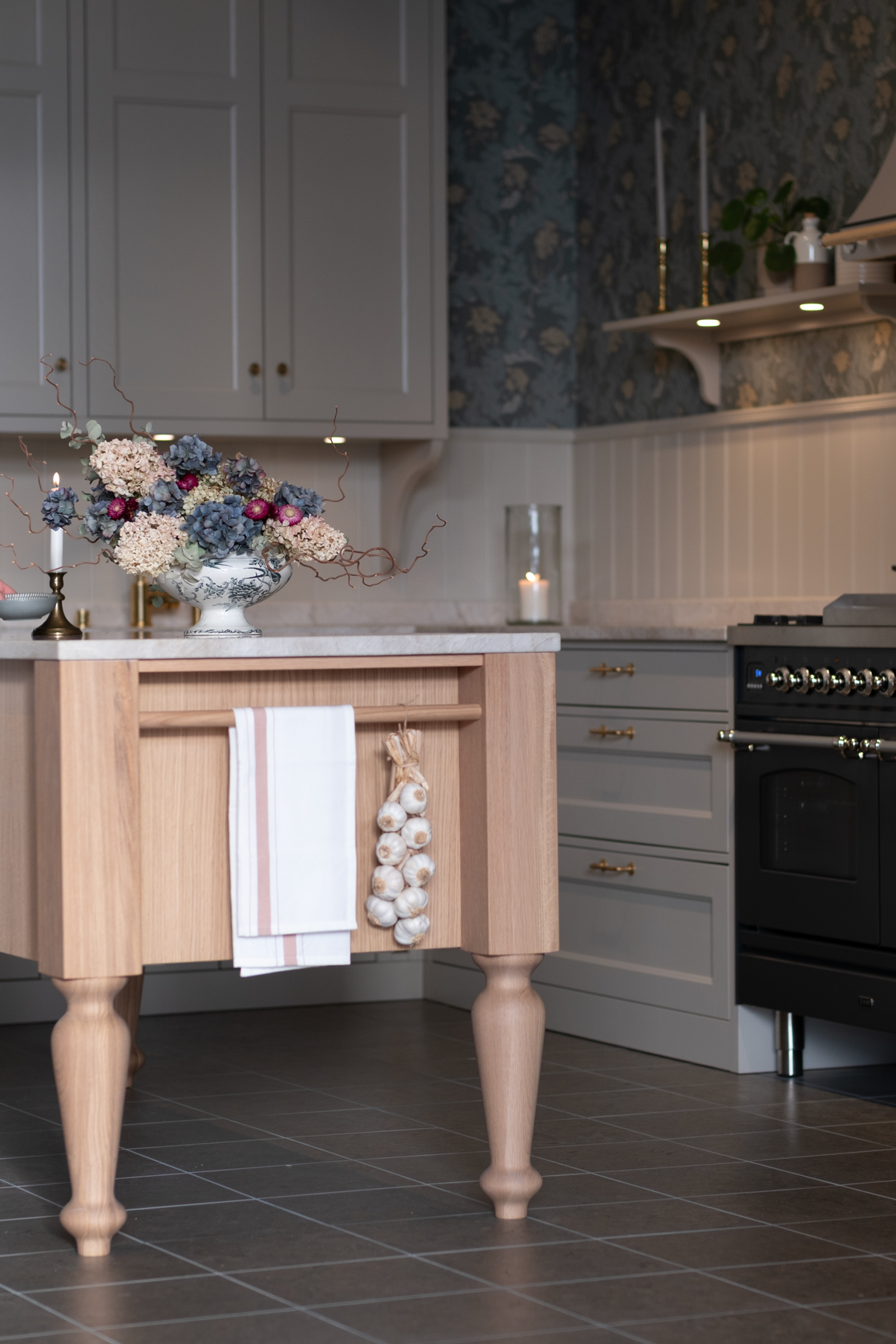 Köksön är rummets hjärta. De massiva träbenen ger en tydlig karaktär och tillsammans med bänkskivan i sten får ön en fin tyngd och ett lugnt uttryck. Här finns plats för både matlagning, läxläsning och samtal över en kopp kaffe.
